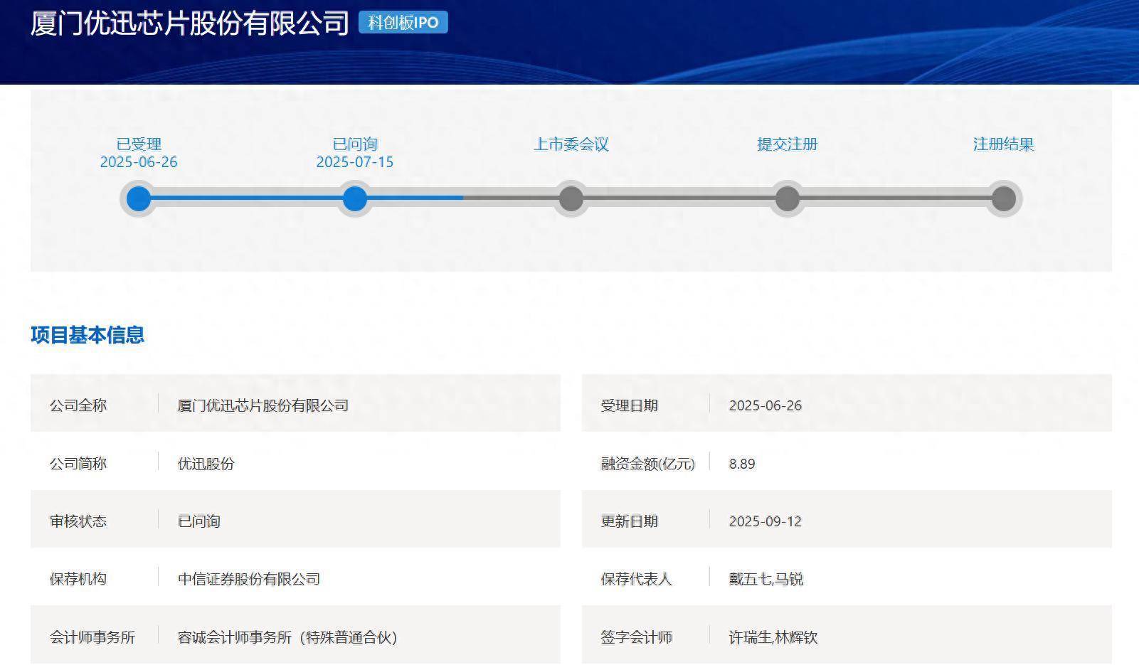 9月12日,上交所官网信息显示,2025年9月19日,上交所上市审核委员会召开2025年第37次上市审核委员会审议会议,审议厦门优讯芯片股份有限公司(简称“优迅股份”)IPO。